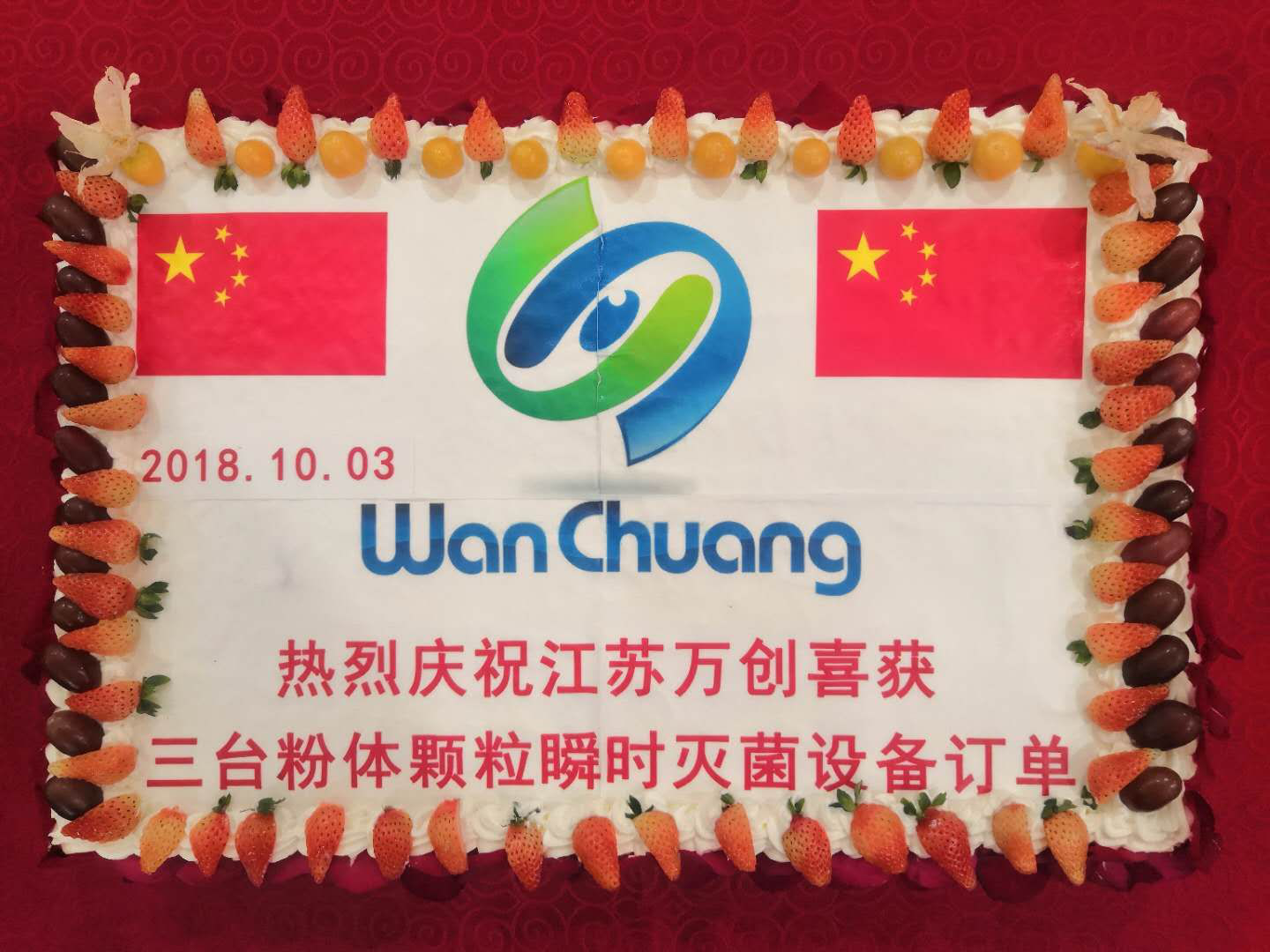 2018年10月03日,公司全体员工欢聚一堂,庆祝万创自主研发的新产品过热蒸汽粉末瞬时灭菌设备成功上市。